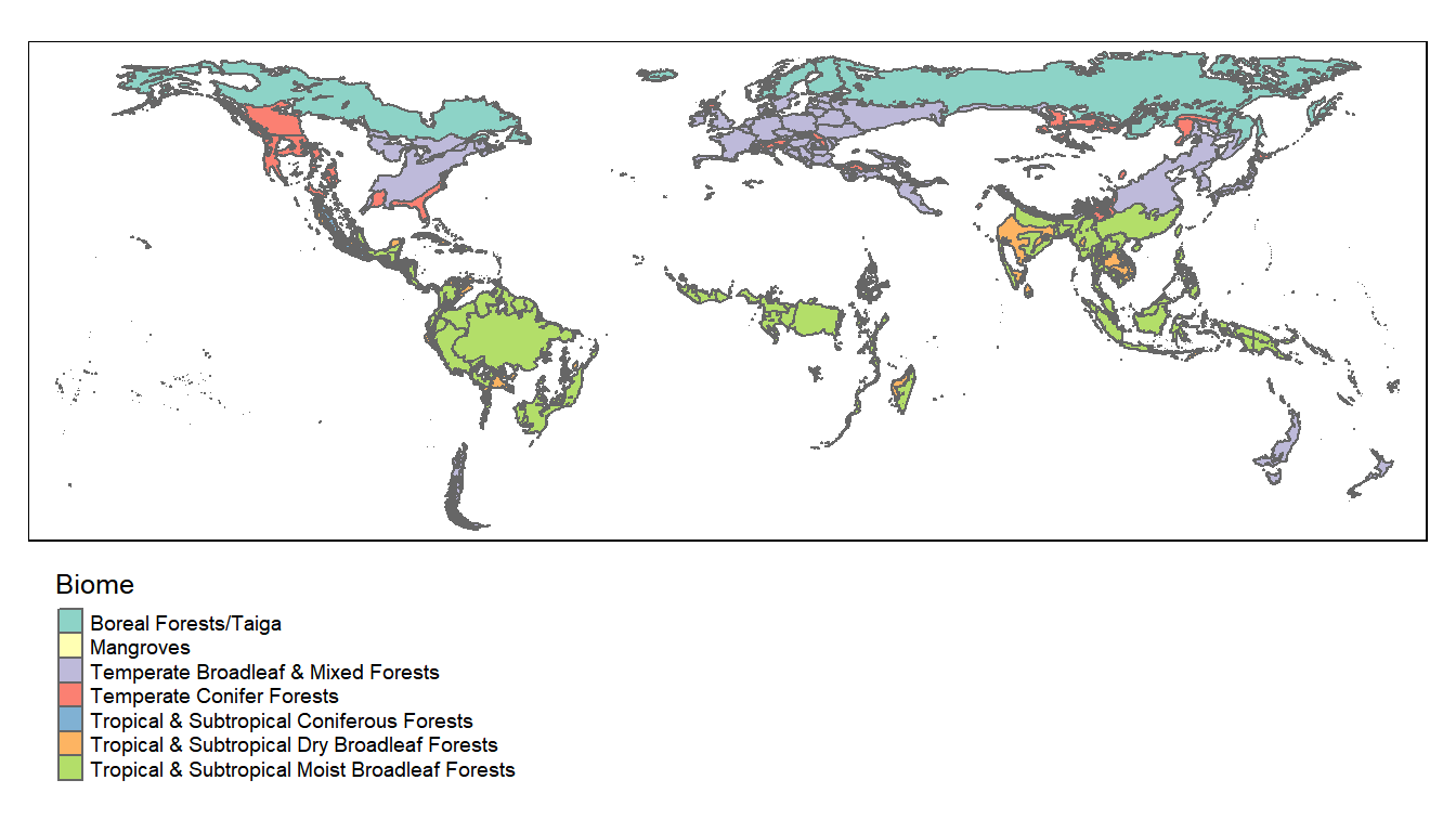# We add this manually, as we had issues with API auth. protocol for GSCdrivers_curtis <- ee$Image("projects/ee-fbedecarrats/assets/drivers_curtis")# We also load the AOIs manually due to the same problemif (!file.exists("revamp/aois/aois_shp.zip")) {dir.create("revamp/aois")st_write(aois, "revamp/aois/aois.shp") aoi_files =list.files(path ="revamp/aois", pattern ="aois.*", full.names =TRUE)zip(zipfile ="revamp/aois/aois_shp.zip", files = aoi_files)}aois_ee <- ee$FeatureCollection("projects/ee-fbedecarrats/assets/aois")# We get the colors used by R using tmaptools::palette_explorer()biome_fills <- ee$Image()$byte()$paint(featureCollection = aois_ee,color ="biome_num")biome_nation_borders <- ee$Image()$byte()$paint(featureCollection = aois_ee,color =1,width =1)r_map_palette <-c("b3de69", # light green: Tropical & Subtropical Moist Broadleaf Forests "fdb462", # light orange: Tropical & Subtropical Dry Broadleaf Forests"80b1d3", # blue: Tropical & Subtropical Coniferous Forest"bebada", # purple: Temperate Broadleaf & Mixed Forests"fb8072", # dark orange: Temperate Conifer Forests"8dd3c7", # turquois: Boreal Forests/Taiga"ffffb3") # yellow: MangrovesMap$addLayer(biome_fills, list(min =1, max =7, palette = r_map_palette)) + Map$addLayer(biome_nation_borders, list(palette ="000000"))
