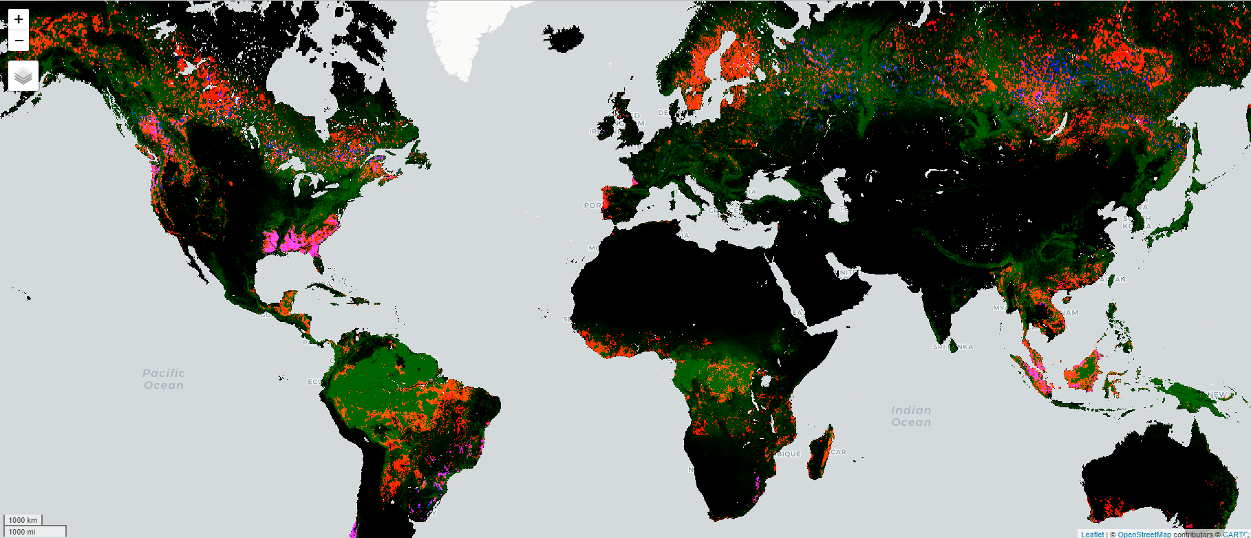 GFC data exported by wolf to be processed on a local computer (green: tree cover in 2000, red: tree cover loss 2001-2018, blue: tree cover gain 2001-2012)