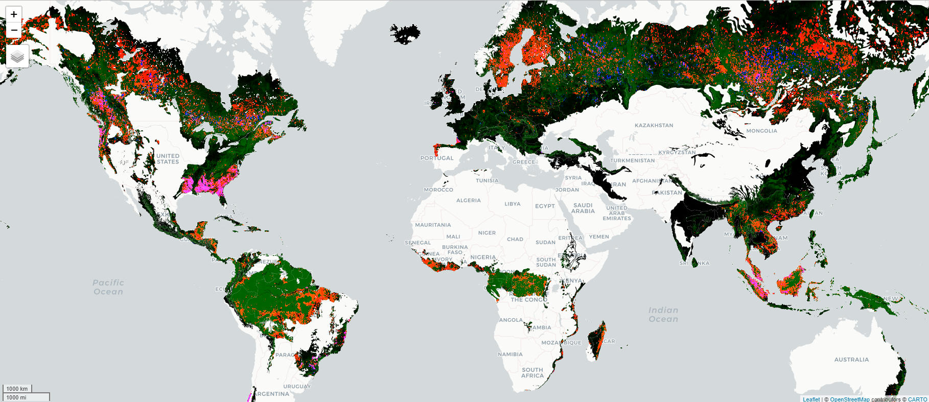 # Hansen/GFC -------------------------------------------------------------------gfc <- ee$Image("UMD/hansen/global_forest_change_2018_v1_6")# We save the output as image to display it in quartogfc_mask <- gfc$select("datamask")$eq(1)gfc_wolf <- gfc$updateMask(gfc_mask)Map$addLayer(gfc_wolf, list(bands =c("loss", "treecover2000", "gain"),max =c(1, 255, 1)))